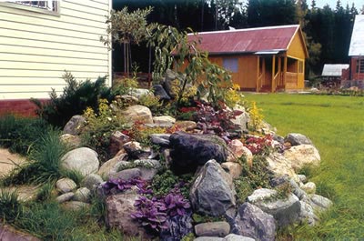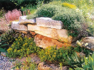 Создание альпийской горки начинается с разметки участка. На предполагаемомместе вырывают котлован и заполняют его щебнем, битымкирпичом или керамзитом, которым отводится роль дренажа.На эти цели можно очень удачно использовать строительныймусор. Иногда его легче и дешевле пустить на хорошеедело, чем вывозить. После устройства основы горки уплотняетсядно котлована, и он засыпается плодородным грунтом вровеньс землей. Землю засыпают послойно, каждый пласт уплотняюти поливают водой, чтобы выявить пустоты. Срок жизнигорки сокращает такое явление, как усадка камней. Дренажделается для того, чтобы земля не «утянула»их в себя. В этих же целях прибегают к неприродным материалам,например, устанавливая камни на опоры из перфорированныхасбоцементных труб, заполненных гравием. Применяют такжецементные, бетонные или кирпичные опорные конструкции.