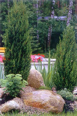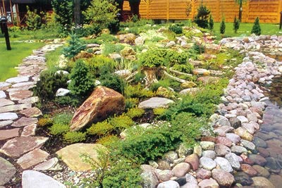 Возможных решений при создании горки множество, всезависит от поставленных эстетических задач. Кто-то устраиваетущелье, кто-то террасу, плато или каменистую тропинку.Одному мил родник, а другому водопад. В азиатских, вчастности, японских моделях преобладают камни и песок,а в европейских предпочтение отдается пышно цветущейрастительности.