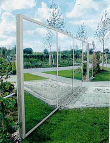 Использование зеркал в оформлении сада позволяет достичь массы интересных эффектов. Зеркало расширяет пространство, показывает отражение двух сторонжизни. Первый <Сад Зазеркалья>, показанный на выставке в германском городеРостроп отражает ландшафт и вовлеченных в него людей, которые смотрят насвое отражение в зеркале, как на фотографию. Ощущение крайне необычное.Создается иллюзия бесконечной перспективы.