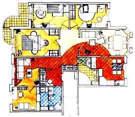 Ввиду особенностей российского менталитета мы смотрим больше под ноги, чем в небо. Потому, видимо, в любом помещении прежде всего обращаем внимание на пол, который на самом деле занимает важное место в интерьере. Пол внушает ощущение открытости пространства, чистоты и порядка в доме, торжественности и комфорта обстановки. Использование различных видов напольного покрытия в одном помещении позволяет "зонировать" пространство. Это хорошо видно на дизайнерских эскизах. В кухне плиткой обкладывается пол рабочей зоны ( эскиз 1). Это практично во всех отношениях. Обеденную зону определяет паркет - теплый натуральный пол под ногами. В гостиной диванная зона обозначена ковролином, соседствующим с паркетом, - мягко и тепло. Границы входной зоны определяет практичный пол из керамической плитки. Продолжение его в коридоре :паркетом расширяет представление о размерах гостинои. В спальне из коридора пол перетекает ковролином, настраивая на покой и отдых.