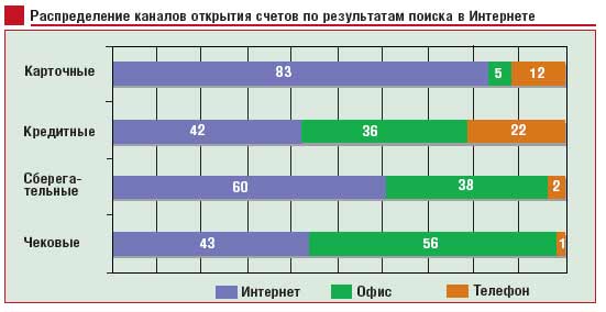 В банках - лидерах по количеству посетителей сайта на один офис Интернет является наиважнейшим инструментом конкуренции. В то же время Интернет-маркетинг может увеличить эффективность многофилиальных банков. В таких банках он способен повысить количество посетителей сайта банка в расчете на один банковский офис и соответственно увеличить количество входящих обращений клиентов на приобретение услуг банка через Интернет, офисы банка и по телефону. Так, например, по результатам исследования компании Yahoo, Интернет-пользователи из поисковых систем, интересующиеся разными финансовыми услугами, часто приобретают их не только через Интернет, но по традиционным каналам - офисы и телефон.