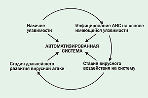 Основным условием первого этапа жизненного цикла вирусной угрозы в АИС является наличие уязвимости, на основе которой потенциально возможно провести вирусные атаки3. Уязвимости могут проистекать из-за недостатков организационно-правового либо программно-аппаратного обеспечения АИС. Первый тип уязвимостей связан с отсутствием определённых нормативных документов, в которых определяются требования к антивирусной безопасности АИС, а также пути их реализации. Так, например, в организации может отсутствовать политика информационной безопасности, учитывающая требования к антивирусной защите. Примерами уязвимостей программно-аппаратного обеспечения являются ошибки в ПО, отсутствие средств защиты, неправильная конфигурация программного окружения, наличие нестойких к угадыванию паролей и др.