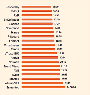 Другим распространённым подходом к защите от вредоносного кода является использование в АИС антивирусных средств защиты только одного производителя, которые устанавливаются на серверы, рабочие станции и сетевые шлюзы. Недостатком такого метода является высокий уровень зависимости от продукции этого производителя. Это означает, что в случае если по какой-то причине будет нарушена работоспособность антивирусного ядра или вендор (производитель ПО) не сможет своевременно обновить свою базу данных, то под угрозой вирусной эпидемии окажется вся инфраструктура компании. Актуальность данной проблемы обусловлена тем, что антивирусные лаборатории по-разному реагируют на появляющиеся компьютерные вирусы. Иллюстрирует это пример, изображённый на рис. 2. Он показывает время реакции различных компаний-производителей на вирус Sober.P, который появился 2 мая 2005 года. Как видите, разница во времени реакции составляет до восьми часов, в течение которых АИС потенциально может быть успешно атакована злоумышленниками. Необходимо также отметить и разницу во времени реагирования компаний на тот или иной вирус: тот производитель, который сегодня первым отреагировал на появление вируса класса А, завтра может последним выпустить сигнатуру для вируса типа Б.
