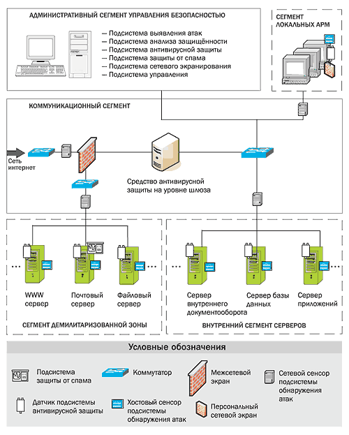· сетевые и хостовые сенсоры, предназначенные для сбора необходимой информации о функционировании АИС. Сетевые сенсоры реализуются в виде отдельных программно-аппаратных блоков и предназначены для сбора информации обо всех пакетах данных, передаваемых в рамках того сетевого сегмента, где установлен сенсор. Данный тип сенсоров должен присутствовать во всех ключевых сегментах АИС, где расположены защищаемые узлы системы. Хостовые сенсоры устанавливаются на рабочие станции и серверы АИС и собирают информацию обо всех событиях, происходящих на этих узлах системы. Хостовые сенсоры могут собирать информацию не только о пакетах данных, но и о других операциях, которые выполняются приложениями, запущенными на узле АИС;