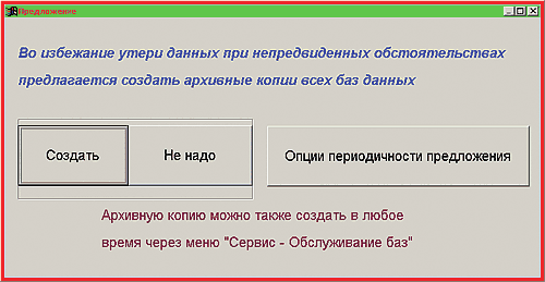 При создании архива программа сохраняет архивные копии всех баз в формате ZIP. Количество таких копий может достигать десяти. Они нумеруются цифрами от 0 до 9, а затем, при создании следующих по порядку копий, нумерация повторяется по циклу. Таким образом, если копии создавались более 10 раз, то хранятся последние 10 копий. При каждом сохранении фиксируется время создания копий. Такая система архивирования обеспечивает наименьшую вероятность потерь данных.