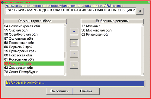В окне импорта классификатора адресов (рис. 4) можно выбрать только те регионы, в которых проживают работники данного предприятия, перенеся данные их из левого окна в правое. Такая полезная возможность позволяет значительно сэкономить место, занимаемое на диске, так как храниться будет не всероссийский КЛАДР целиком, а только нужная его часть. Если в процессе работы выяснится, что надо ввести ещё какие-либо регионы, то это можно сделать повторным вызовом функции импорта КЛАДР.