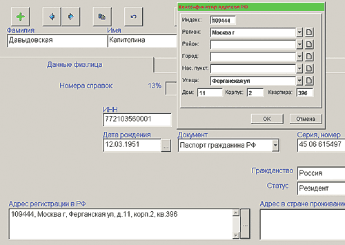 Если не заполнить поле почтового индекса, то он определится автоматически после ввода адреса при условии, что все данные соответствуют классификатору.