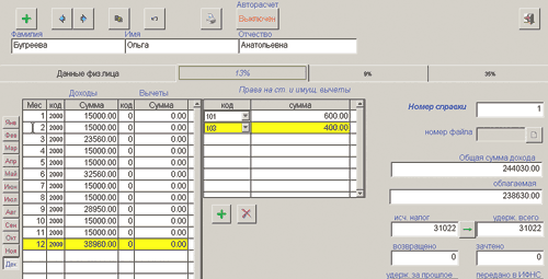 Коды доходов и вычетов выбираются из раскрывающегося списка на основе справочников.