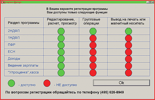 Демоверсия довольно либеральна: разрешает делать всё, кроме групповых операций и операций вывода. Как стало понятно выше, полную функциональность при сопутствующей бесплатности демонстрирует только один раздел — “2-НДФЛ”.