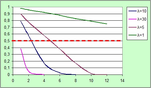 А теперь посмотрим на кривую синего цвета (интенсивность обнаружения уязвимостей - 10 в год), определим вероятность того, что в любой момент времени системное средство защищено в предположении, что пакеты обновлений появляются 1 раз в месяц, получаем менее 0,2. Но тогда, о какой безопасности может идти речь в принципе, если только 20% рабочего времени компьютер защищен (а ведь 10 уязвимостей в год это далеко не предел для современных системных средств)!