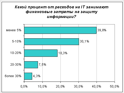 (Новость от 18.10.2006). Российский рынок средств защиты информации сегодня развивается довольно динамично. При этом в нашей стране отмечается значительное ежегодное увеличение количества зарегистрированных преступлений в сфере компьютерной информации. Следует отметить, что свыше 99% правонарушений совершается умышленно. Несмотря на то, что проблема информационной безопасности с каждым годом становится все острее, некоторые промежуточные результаты исследования "Средства защиты информации от несанкционированного доступа", проводимого журналом "Информационная безопасность/Information Security" (компания "Гротек") носят парадоксальный характер. Большая часть опрошенных (39,8%) считают, что отечественные компании и организации весьма неохотно идут на увеличение расходов на информационную безопасность (см. диаграмму, рис.3). Для сравнения: в большинстве зарубежных компаний, затраты на информационную безопасность составляют в среднем около 15% от бюджета информационных технологий компаний.