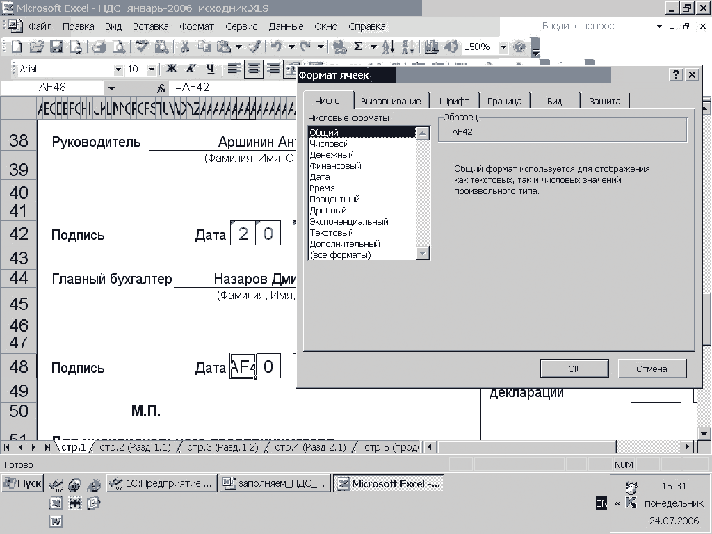 Как правило, “даты подписи” директором и главным бухгалтером совпадают. Поэтому мы получим “дату подписи” главным бухгалтером, а также “даты” в разделе 1.1 (если нужно, то и в разделе 1.2), заполняя только “дату подписи” директором. В нашем примере “датой подписи” директором является 20.02.06. В 1-й ячейке “даты подписи” главным бухгалтером вводим символ “=” и ссылаемся на 1-ю ячейку в “дате подписи” директором, кликнув по ней мышью и нажав на клавишу Enter.