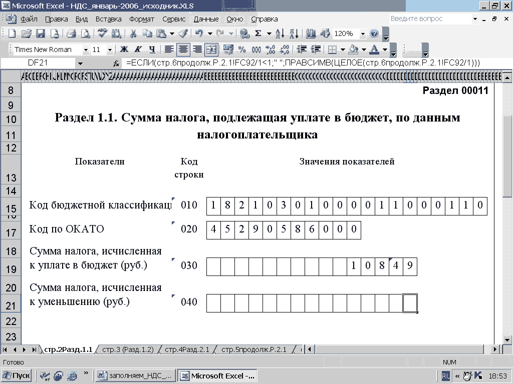Основное отличие “полученных прочерков” от введённых вручную заключается в том, что с ними можно производить арифметические операции. Что мы и увидим, заполняя раздел 1.1 “Сумма налога, подлежащая уплате в бюджет, по данным налогоплательщика”.