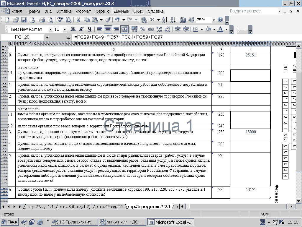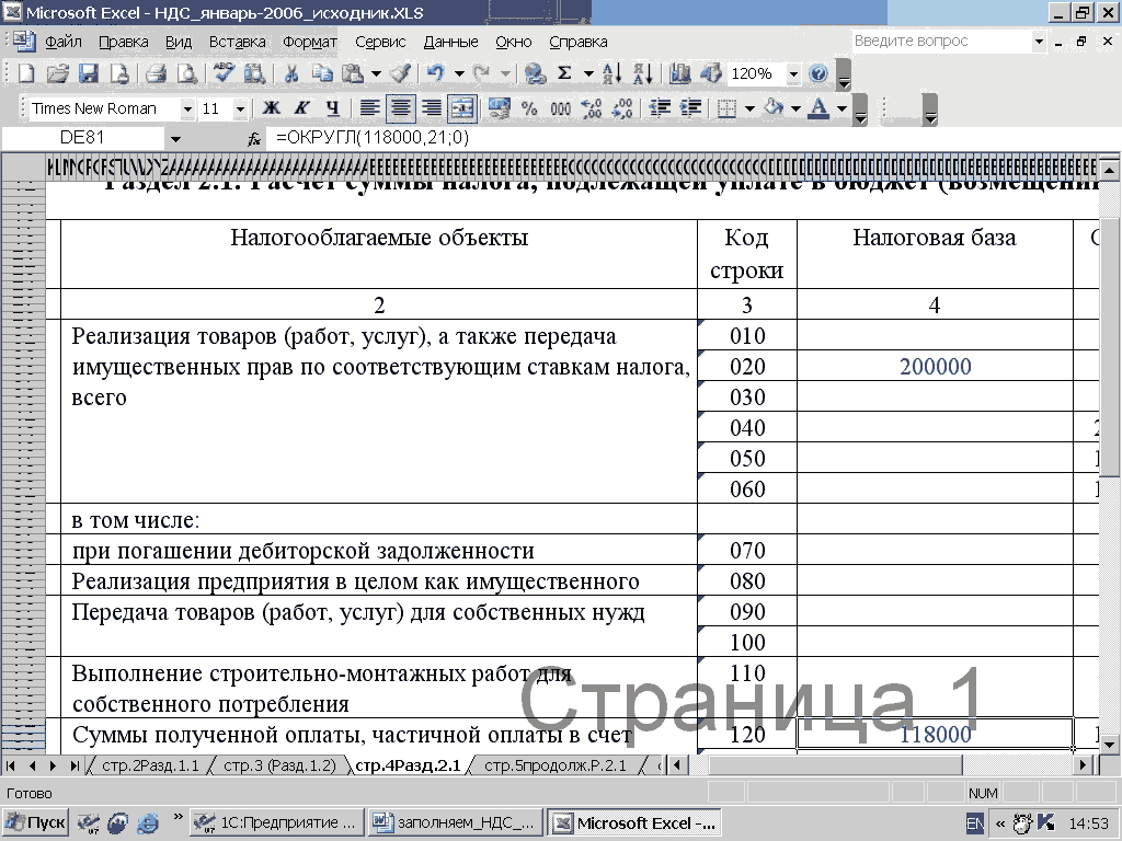 В разделе 2.1 данные в графе “Налоговая база” будут переменными, на основании которых мы автоматически рассчитаем графу “Сумма НДС”. Кроме того, это позволяет свериться с данными в учётной программе.