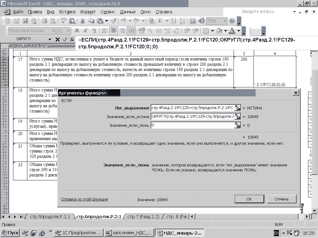 Далее в поле “Лог_выражение”, предварительно поместив в него курсор, нам необходимо сравнить значения строк 180 и 280. Для этого переходим на страницу декларации, на которой содержится значение строки 180. В нашем случае это лист с именем “стр.4Разд.2.1”. После этого щёлкаем левой кнопкой мыши по ячейке строки 180 декларации, вводим с клавиатуры знак “больше” (>) и переходим на лист с именем “стр.5продолжР.2.1”, здесь кликнем мышью по ячейке строки 280 декларации.