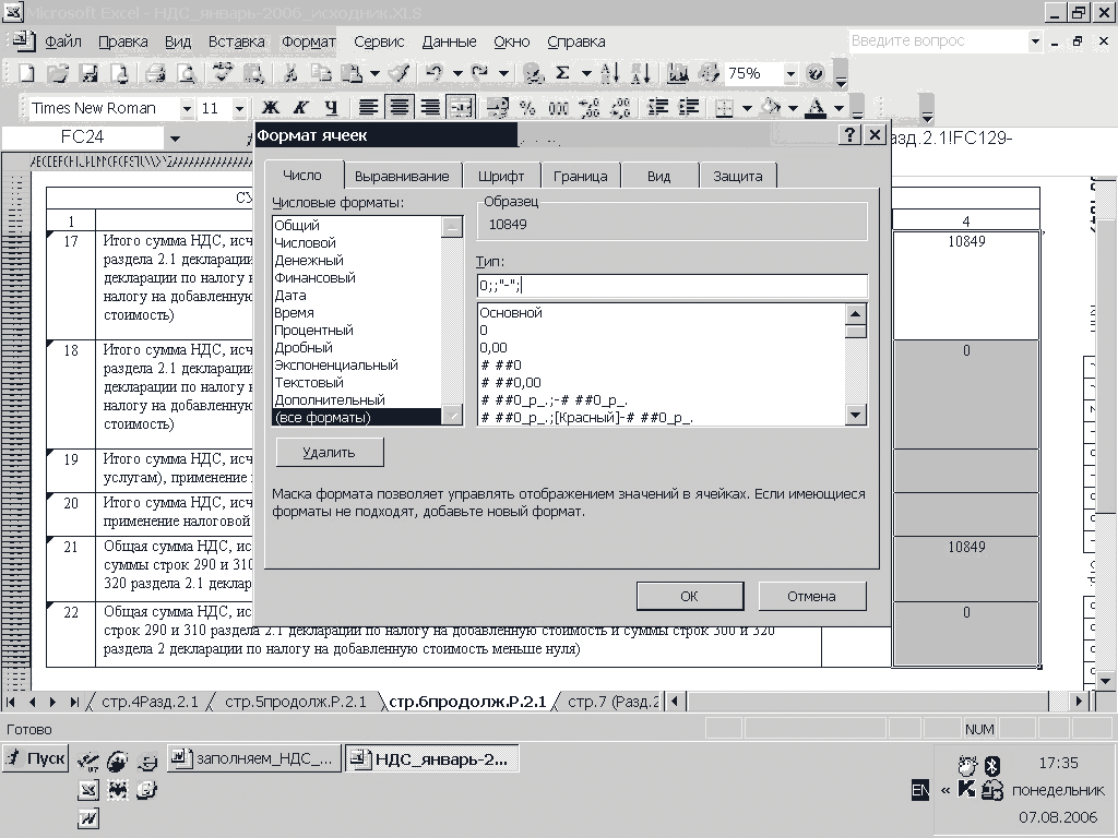 Предварительно выделим ячейки строки с 290 по 340 графы 4 декларации. Далее последовательно из меню: Формат ХЯчейки переходим на вкладку “Число” и в списке “Числовые форматы” выбираем “Все форматы”. В поле “Тип” вводим: 0;;"-";.