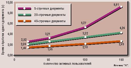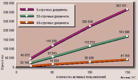 1. В максимальном тестовом варианте при одновременной работе 150 пользователей (для документов объемом 40 строк) система обрабатывала более 300 тысяч вводимых строк в час (рис. 1). Однако это еще далеко не предел возможностей решения по нагрузке.