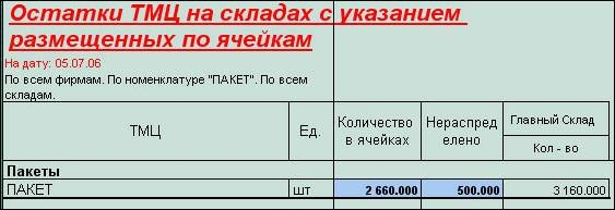 Отчет "Несоответствие остатков/ячеек" служит контролем за "расторопностью" сотрудников, отвечающих за размещение. Он показывает, по каждому выбранному в отчет товару, его количество по регистру "Остатки ТМЦ" в сравнении с остатками по ячейкам, а также разницу этих значений. Таким образом можно проследить какой товар размещен верно, не размещен совсем, размещен не полностью или товар умудрились разместить больше, чем оприходовали. В примере ниже – товар "пакеты" размещен не полностью: