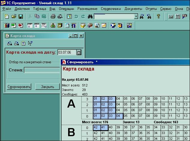 где синим отражены занятые ячейки, бесцветные - пустые. По двойному клику на ячейке – появляется информация о товаре и количестве внутри данной ячейки: