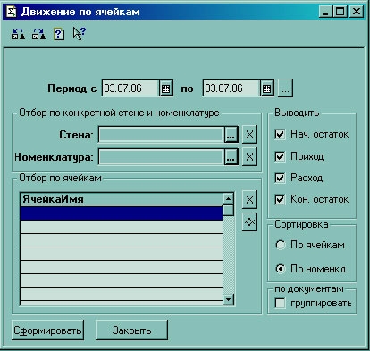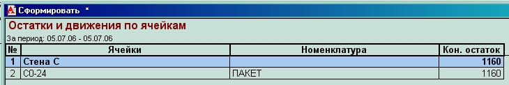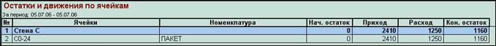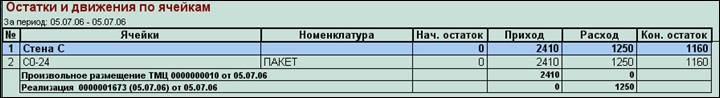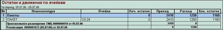 Второй способ – подробно, в виде таблицы – через "Отчет: Движение по ячейкам" с возможностью отображения в разрезе либо ячеек, либо номенклатуры, а также, дополнительно к этому, есть возможность группировки по документам движения.