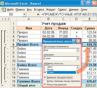 В рабочей таблице могут быть автоматически подведены итоги по любой группе данных. При этом не нужно писать никаких формул. Внесенные изменения автоматически корректируют все данные.