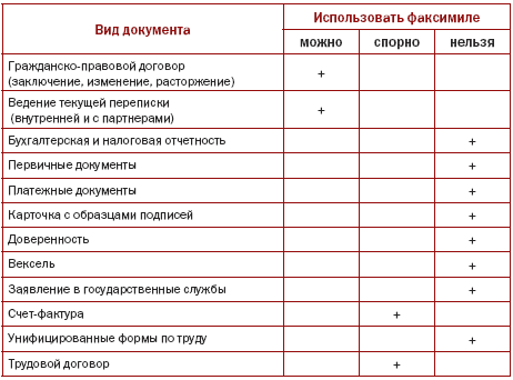 Представим выводы в виде таблицы, в которой приведем оценку правомерности использования факсимиле при составлении и оформлении различных видов документов.