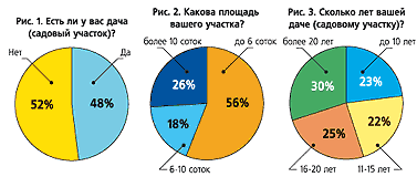 Как показали результаты исследования, проведенного маркетингововой компанией «ТОЙ-ОПИНИОН», 48% петербургских семей имеют дачу/садовый участок (рис. 1). Более половины участков по площади не превышают 6 соток, 18% опрошенных владеют участками площадью от 6 до 10 соток, у остальных участки большей площади (рис. 2). При этом существенной зависимости площади участка от его «возраста», вероятно, нет. Можно заметить, что «возраст» большинства участков большой площади - более 20 лет. Вообще же более 20 лет назад было создано около трети участков. Примерно четверть - в период между 1984 и 1988 годом. В последние 15 лет процесс замедлился. Владельцев «новых» участков (менее 10 лет) - около 23% (рис. 3).