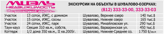 На исторической территории бывшего имения графа Шувалова (а это живописнейший уголок Петербурга!) любой желающий может приобрести земельный участок, коттедж или секцию в таун-хаусе. Причем "котов в мешке" в данном случае никто не предлагает: прежде, чем совершить покупку, вы может ознакомиться с ними самым непосредственным образом. А именно: совершить ознакомительную экскурсию в район Шувало-Озерки в любое удобное для вас время. Такую экскурсию по элитным эксклюзивным земельным участкам или коттеджам проведут квалифицированные специалисты, которые все расскажут, покажут и дадут все необходимые разъяснения.