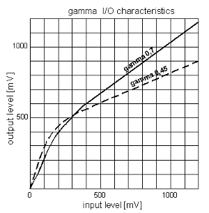 Гамма коррекция является обязательным элементом любой телевизионной камеры. С помощью этого вида нелинейной обработки сигнала происходит согласование логарифмического закона восприятия освещенностей человеческим глазом с линейной зависимостью свет-сигнальных характеристик телекамеры и видеомонитора. Упрощенно говоря, гамма коррекция состоит в дополнительном усилении слабых уровней сигнала. В телекамерах используют различные степени гамма коррекции от 0,7 до 0,45.