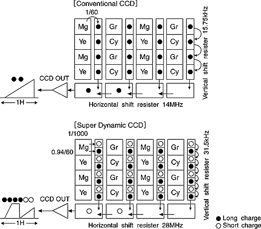 Рис. 9 Иллюстрация способа расширения динамического диапазона для камер серии "Super dynamic" -а), топология стандартной и "Super dynamic" матриц ПЗС - б) и механизм преобразования сигналов в DSP процессоре - в) из рекламного проспекта фирмы Panasonic.