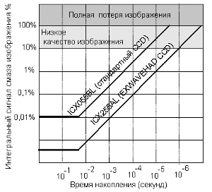 Рис 3. Зависимость интегрального сигнала "смаза" изображения для телекамер на стандартной матрице ПЗС ICX055BL и EXWAVEHAD ПЗС типа ICX255AL от времени накопления при частоте полей 50 Гц.