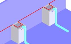 Аспирационный дымовой пожарный извещатель состоит из системы труб (из ABS или UPVC пластика, меди, нержавеющей стали диаметром 25 мм или 3/4") с отверстиями (рис. 1) диаметром 2 – 3 мм, через которые воздух из контролируемой зоны поступает в центральный блок (рис. 2), где установлены дымовые пожарные извещатели и турбина для обеспечения потока воздуха. Формирование направленных воздушных потоков в защищаемом объеме значительно снижает влияние кондиционеров, расслоения воздуха, уменьшения удельной оптической плотности в помещениях с высокими потолками по сравнению с точечными дымовыми извещателями и т.д. Длина труб ограничивается временем транспортировки и может достигать 75 метров, что позволяет защищать помещения с большими площадями.