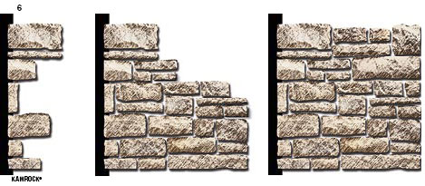 6. Монтаж облицовки начинается с угловых элементов, далее камень укладывают снизу вверх.