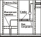 В случае необходимости (например, наращивания) стоечные профили скреплять при помощи шурупов LN 9. Соединение производить с нахлестом не менее 10h, где h - высота спинки профиля в мм. Для ПС 50 нахлест - > 500 мм, ПС 75 - > 750 мм, ПС 100 - > 100 мм.По дверной коробке смонтировать опорные стоечные профили и горизонтальную перемычку из ПН-профиля. Установить промежуточную стойку из ПС-профиля, на которой должен быть расположен стык смежных листов. При 2-х слойной обшивке установить две стойки для обеспечения перехлеста 1-го и 2-го слоя.Для укрепления опорных стоек дверного проема при весе двери до 30 кг, вставить и закрепить в них деревянные бруски или смонтировать дополнительные стойки, скрепив их с основными через вкладыши из ПС (ПН)-профиля.Через отверстия в стенках стоек пропустить силовую и слаботочную разводку с таким расчетом, чтобы она впоследствии не была повреждена шурупами. Вывод проводки наружу производить через отверстия в обшивке, обозначенных в проекте, при этом эл. коробки устанавливать друг против друга со смещением не менее 1,0 м.