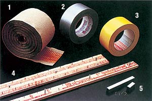 Вспомогательные материалы для укладки: 1 - термолента; 2, 3 - скотч, 4 - грипперные рейки, 5 - скобы