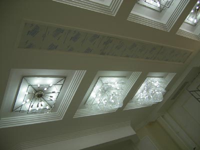Толщина покрытия не превышает обычно 10 мм, это качество позволяет применять его в помещениях с небольшой высотой потолка - 2,5 - 2, 6 м. К сожалению, клеевой способ крепления материала позволяет скрыть только незначительные отклонения по горизонтали. Он ограничивает возможности освещения, исключая использование встроенных светильников и не "маскирует" никакие технические приспособления, в том числе электрическую проводку.