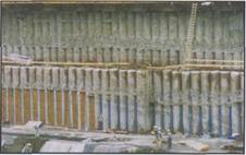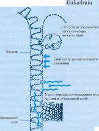Вода, проникающая через фильтр во внутреннюю структуру мата, теряет напор и стекает вниз, попадая в дренажную трубу. Внешние фильтры Енкадрайна обладают замечательным свойством - они не заиливаются. Глинистые частицы грунта проходят сквозь фильтр и вымываются водой через дренирующий слой. Крупные частицы грунта задерживаются фильтром и предотвращают попадание последующих мелких частиц в дренажный слой (рис.1). Структура Енкадрайна обеспечивает высокие дренирующие характеристики, а главное - долговечную работу материала в сложных условиях. Кроме того, при использовании Енкадрайна нет необходимости устанавливать дорогостоящую многослойную гидроизоляцию, так как дренажный мат снимает напор грунтовых вод и защищает поверхность гидроизоляции от механических повреждений. Маты поставляются в рулонах по 30-45 м, ширина мата 1 м, толщина - 22 мм. Енкадрайн имеет специальные выпуски из фильтров по 10 см с каждой стороны, которые защищают стыковочные швы и предотвращают попадание грунта в дренажный слой с торцевых сторон. Материал легко режется и стыкуется с различными элементами конструкции.