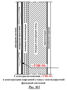Использование "ТЗИ-М"® в качестве защитного паропроницаемого барьера между утеплителем (например, 2 слоя матов из супертонкого базальтового волокна марки "БАЗАЛЬТИН"® общей толщиной 100 мм) и вентилируемой воздушной прослойкой в любой фасадной системе стабилизирует тепловые процессы в конструкции и практически предотвращает конвекционный вынос тепла из здания. При этом основной утеплитель, несмотря на негативное влияние вентилируемой воздушной прослойки, практически не теряет своих теплозащитных свойств, сохраняя их на уровне не менее: