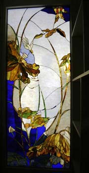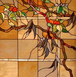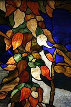 Это в корне отличает витражи, выполненные в технике тиффани, от других. Во-первых, можно создавать довольно сложные композиции, которые включают в себя очень мелкие детали. В отличие от свинцового профиля фольга позволяет соединять даже самые небольшие кусочки под любым углом друг к другу, по весьма прихотливо изогнутым линиям. Так и получается красивый силуэтный рисунок внутреннего каркаса.