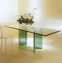 Другой стеклянный столик формой своей напоминает мебель, стоявшую еще в римских палаццо. Та мебель была из мрамора, а столешницы опирались на мраморные колонны. Теперь прозрачная поверхность стола опирается на стеклянные же полукруглые ножки, своей формой и рифлением напоминающие те римские мраморные колонны. А в целом этот легкий и лаконичный столик только кажется простым - красота его античных форм бесспорна.