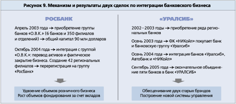 От способа интеграции приобретенного бизнеса с уже существующим зависит многое. В качестве примеров можно использовать две крупнейшие за последние годы сделки по интеграции бизнеса и филиалов вновь приобретаемых банков, которую провели Росбанк и «Уралсиб».