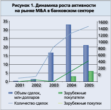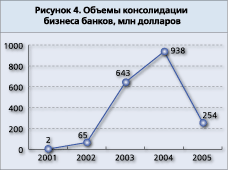 Мы рассматривали инвестиции российских банков и банковских групп, сделанные в приобретение других банков в РФ. При этом суммы сделок, связанных с консолидацией ранее приобретенных активов, относятся к периоду совершения покупки, а не к периоду завершения юридических процедур слияния. Поэтому сделки, например, группы «Уралсиб» или Русского генерального банка (Инвестсбербанка) относятся к 2003—2004 годам. Наиболее активными группами, консолидирующими банковские активы, становились: в 2003 году — ФК «НИКойл», Росбанк, Пробизнесбанк, Русский генеральный банк, в 2004 году — «Уралсиб», General Electric Consumer Finance, Внешторгбанк, ЕБРР, в 2005 году — Societe Generale, Сибакадембанк, «Зенит», IFC, Intesa.