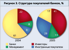 Если раньше основной спрос шел со стороны российских банков, то в 2005 году около 2/3 инвестиций сделано небанковскими группами инвесторов и зарубежными покупателями. Особенно заметен рост доли иностранных инвестиций — всего за один год их доля в структуре выросла более чем в три раза. В настоящее время иностранные финансовые группы формируют около 1/3 спроса на российские банки. Фактически эта оценка может быть и выше, особенно с учетом объема ресурсов в распоряжении международных финансовых групп и относительно более высокой стоимости сделок с их участием.