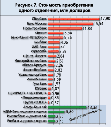 Из рисунка 9 видно, что относительная стоимость приобретения Росбанком региональной сети банков «О.В.К.» — одна из самых низких среди изученных сделок. Например, если КМБ-Банк с 30 отделениями был оценен в 120 млн долларов, то 250 отделений «О.В.К.» обошлись группе «Интеррос» «всего лишь» в 200 млн долларов.