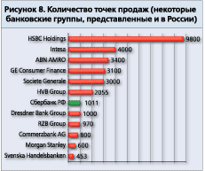 Приведенные данные свидетельствуют, что количество не всегда переходит в качество. Именно поэтому наличие небольшого количества, но сильных региональных подразделений у Промстройбанка или банка «Зенит» ничуть не менее значимо, чем наличие сети из 200—500 отделений, работающих в рознице. Кстати, пока в масштабах мировых банков филиальные сети российских банков невелики. Для сравнения можно привести следующие данные (рис. 8).