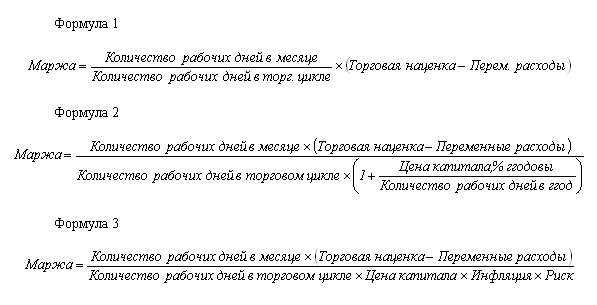 Маржа определяется на основе двух показателей: торговой наценки (как в абсолютном, так и в относительном исчислении) и периода оборачиваемости дебиторской задолженности (торгового цикла). Чтобы абстрагироваться от условий работы с различными покупателями, необходимо привести их к единому показателю – среднедневной марже. Этот показатель определяется как отношение валовой маржи за месяц к количеству рабочих дней в месяце [2]. Валовая же маржа считается по формуле 1.