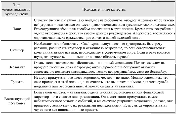 И, поскольку все в природе уравновешено, не будем забывать о хороших сторонах «невозможных» руководителей. В таблице представлен только минимум, остальное додумайте сами, глядя на любимого начальника.