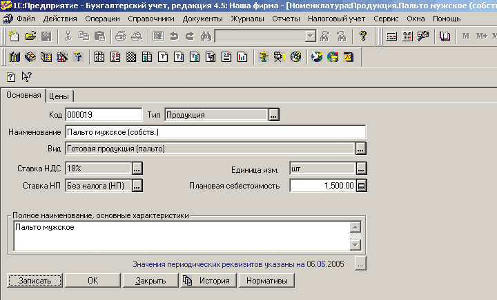 При вводе элемента в справочник “Номенклатура” надо следить, чтобы в обязательном порядке были заполнены все предлагаемые программой поля.