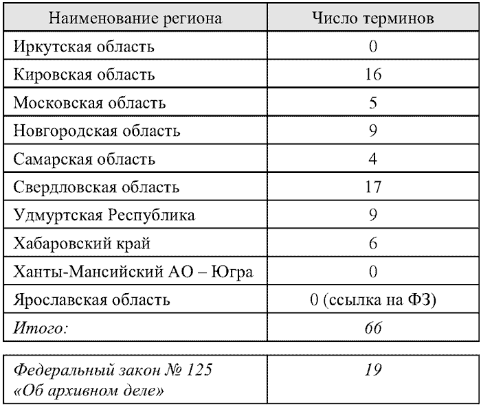 Всего в законодательстве субъектов Российской Федерации дано 32 различных термина. Из 19 определений понятий, приведенных в Федеральном законе, только одно — «депозитарное хранение документов Архивного Фонда Российской Федерации» — не было использовано в региональных законах ни разу. Из общего числа терминов, включенных в региональное законодательство, три четверти заимствованы из Федерального закона. При этом определение «архивного дела» дано в половине законодательных актов, а термины «архивный фонд», «государственный архив», «документ Архивного фонда» приведены в 40% соответствующих законов.