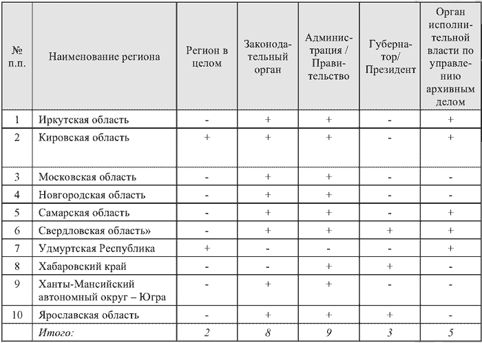 Определение полномочий органов государственной власти регионов стало одной из главных целей регионального законодательства. В Таблице 2 приведены данные о том, каким органам власти предоставляются полномочия в области архивного дела в соответствии с региональным законодательством.